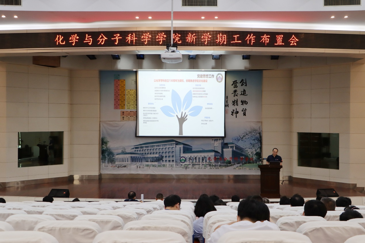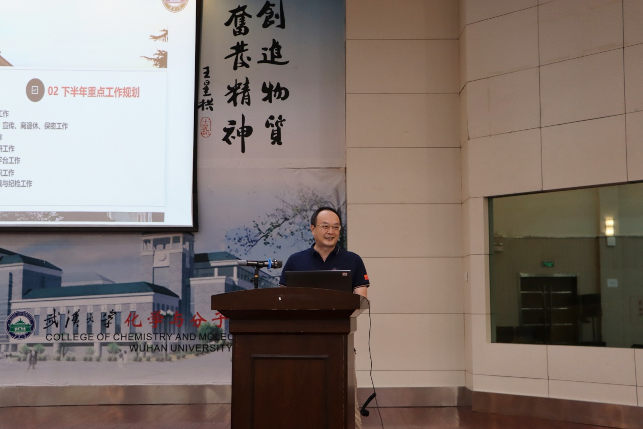 院长庄林全面回顾了上半年工作成绩,对学院师生付出的努力给予了充分肯定。他结合学院当前发展情况与工作目标,对于新学期全院工作进行了重点规划和工作部署。他强调,招生工作是学院各方面工作之核心,学院将招生宣传工作摆在落实立德树人根本任务、努力建设高质量人才培养体系的高度,进一步强化抓好本科招生的责任担当,凝共识、聚合力,提升学院生源质量。他提出,学院在组织承担国家重大科研项目方面面临瓶颈,全院上下需聚焦目标,有组织的进行规划布局,持续发力,力争在能源化学和分子医学等重点领域尽快取得突破,为学院新一轮双一流建设奠定更加坚实的基础。