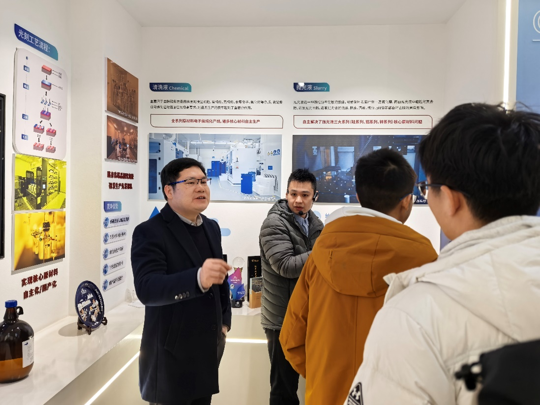 1月16日上午,学院副院长蒋风雷,学工办主任蒋莉,副主任杨子豪带队参观了湖北鼎龙控股股份有限公司。企业相关负责人详细介绍了公司从打印复印用电荷调节剂、彩色聚合碳粉等高技术材料起步,逐步发展成为在湖北,长三角,珠三角广泛布局,成为全国领先的各类关键创新材料的平台型企业,深度拓展半导体制程工艺、新型显示、半导体先进封装用高端材料的创新历程。同学们深入了解了晶圆制造、封装过程及相关材料技术,并通过抛光垫等实物模型,直观感受到纳米级精度抛光工艺的技术魅力。在参观环节,同学们透过车间观察窗,看到了高度自动化的生产线仅需初始投料,后续流程均由智能化系统完成。研发实验室里技术人员专注工作的场景,也让同学们感受到了企业浓厚的创新氛围。