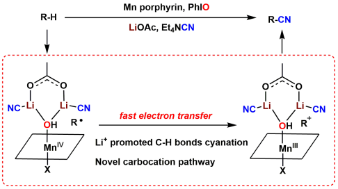 直接活化烷烃的惰性C-H键构筑各类官能团(如氰基),合成功能有机分子是理想的合成途径。然而烷烃的C-H键键离解能较高,将其活化难度较大。以细胞色素P450为代表的氧化酶体系能够在温和条件下高效活化烷烃的C-H键,但其反应产物主要为经历“氧反弹”途径的羟化产物,这极大限制了氧化酶及其仿生氧化体系在合成化学中的应用。本工作在锰卟啉仿生氧化体系中引入Li+作为路易斯酸,使之与仿生氧化过程中的活性物种高价锰-氧中间体形成弱相互作用,抑制经典的“氧反弹”路径,同时引入氰基化试剂,成功实现了有机合成中极具挑战的惰性碳-氢键氰基化反应。