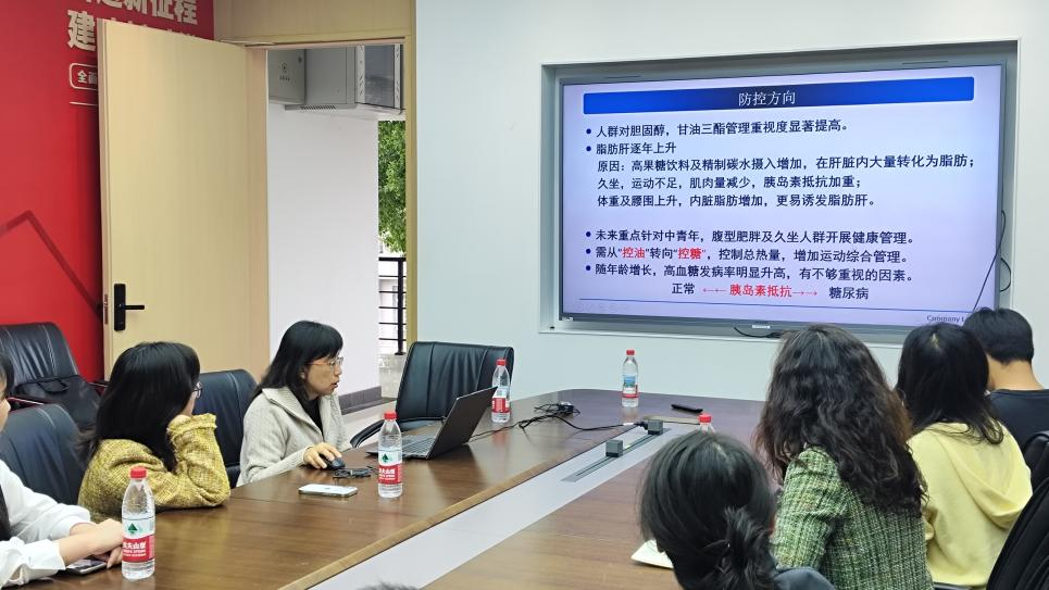 王玲主任作了题为《关注体检,守护健康—化学院职工体检汇总分析》的专题讲座。她结合学院教职工的具体体检数据,从四个方面与在场师生进行了深入交流:一是学院整体的体检异常结果分析;二是强调体检的重要性,特别是早期癌症筛查和慢性病的早期管理;三是介绍体检中心新增的特色项目与非常规体检项目;四是针对常见的“血脂异常”问题,进行了简明易懂的科普讲解。讲座结束后,校医院的医务工作者还为大家提供了免费的血糖、血压测量服务。大家踊跃体验,并就自身关心的健康问题与医务人员进行了现场咨询交流。