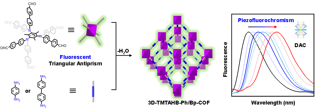 汪成教授团队的最新研究成果,该研究报道了基于新型六连接反三棱柱荧光节点的压致荧光变色三维共价有机框架材料。