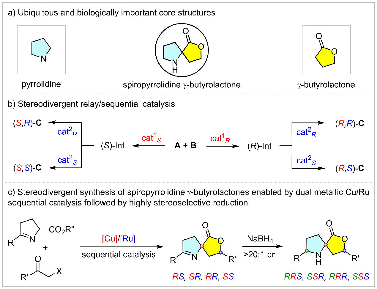 长期以来,高效合成结构复杂且具有重要生物活性的杂环分子,一直是合成化学和药物化学的前沿领域。其中,吡咯烷因其广泛的生理活性被认为是优势的氮杂环骨架,在2013至2023年间获FDA批准的小分子药物中位列第三。与此同时,γ-丁内酯作为另一类重要的含氧杂环结构,也因其显著的生物相关性备受关注。将上述药效团进一步整合至螺环骨架中,相较于平面结构类似物,可显著提升靶点选择性与代谢稳定性,在当前药物研发中备受关注。另一方面,开发简洁、高效的立体发散性合成策略,精准构建含有非相邻手性中心的手性分子,仍是不对称催化领域的一项关键挑战,此类结构的传统合成方法往往受制于冗长的合成路径。相比之下,顺序或接力催化策略展现出独特优势,能够对连续反应步骤中生成的手性中心进行独立的立体化学控制,从而可实现从简单原料出发,以符合绿色化学原理的一锅法方式立体发散性获得所有可能的立体异构体。